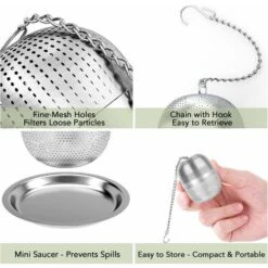 【Avec bac d’égouttage et chaîne】Colis comprend 2 boules filtres à thé en acier inoxydable + un bac d’égouttage. Vous pouvez placer les boules à thé sur le bac d’égouttement, pratique et hygiénique, sans toucher directement la table. Et avec la longue chaîne, les boules de thé sont faciles à accrocher dans une bouilloire ou une grande tasse, évite de glisser dans la tasse.