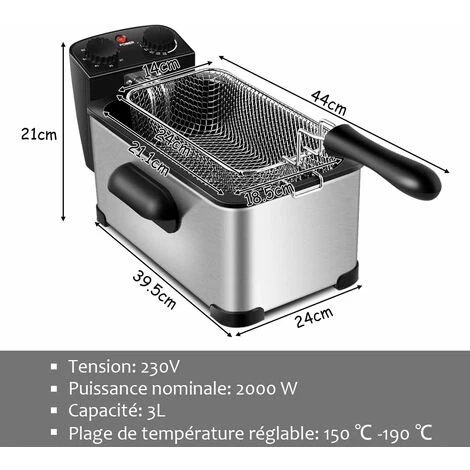 - 【Grande capacité et haute performance】équipée d’un réservoir de 3 L, notre friteuse vous permet de préparer jusqu’à 1,6 kg d’aliments pour toute la famille. Dotée d’une résistance chauffante de 2000W, elle chauffe rapidement et maintient une température constante. Cette friteuse permet de faire frire rapidement les aliments et d’obtenir un croustillant parfait.