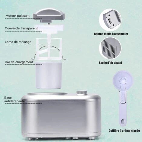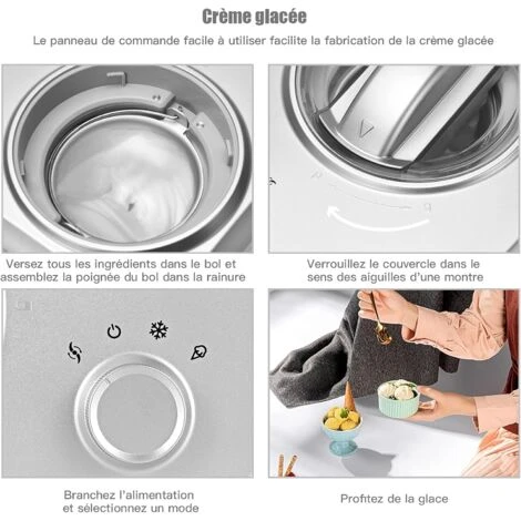 - 【Glace à faire soi-même】Cet appareil à glaces vous permet de confectionner de délicieuses glaces ou sorbets maisons en quelques minutes. Vous pouvez créer votre propre parfum en contrôlant la liste des ingrédients. Ajoutez la préparation dans le bol congelé et choisissez un mode de fonctionnement et attendez que la glace se fasse.