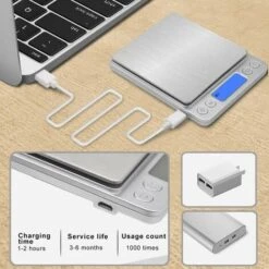 - FONCTION DE CHARGEMENT USB – La balance de cuisine est fabriquée de manière écologique, fournie avec un câble de chargement USB. L’avertissement de batterie sur l’écran LCD continue de clignoter lorsque le chargeur USB est branché et est normalement chargé. Le symbole clignote: Charge. Le symbole disparaît, le rétroéclairage s’allume: Charge complète. Indicateur de surcharge.