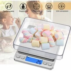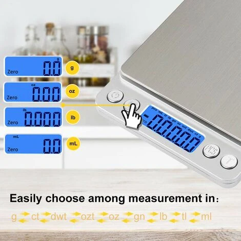 - 9 UNITÉS DE PESAGE CONVERTI – Balance fine mesures précises. Grand écran LCD, 9 unités de pesée: g / ct / dwt / ozt / oz / gn / lb / tl / ml. Large gamme d’applications: nourriture, bijoux, lait, médecine, céréales, etc.