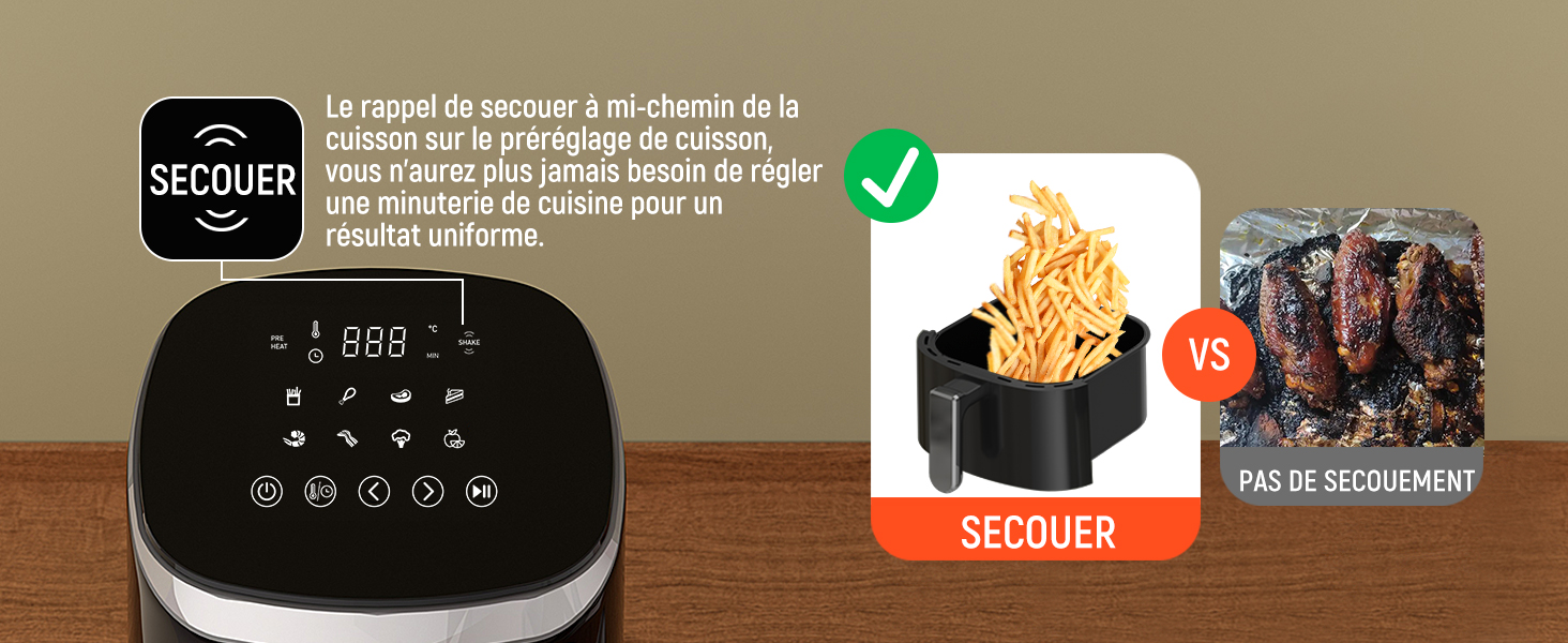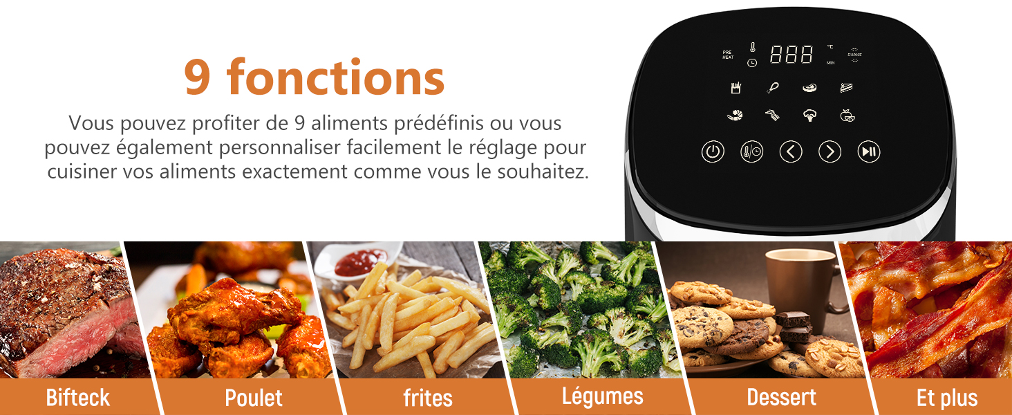 - 9 EN 1 RÉPOND À TOUS VOS BESOINS: Le grand écran numérique avancé dispose de 9 modes prédéfinis (frites, poulet, steak, dessert, fruits de mer, bacon, légumes, déshydratation, préchauffage. Vous pouvez régler le temps (1 à 60 minutes) et la température (65 ° C~230°C) pour tout personnaliser en fonction de vos recettes frites à l’air. Et le rappel de secouer vous permet de savoir quand secouer vos aliments pour une cuisson plus uniforme et des textures croustillantes.