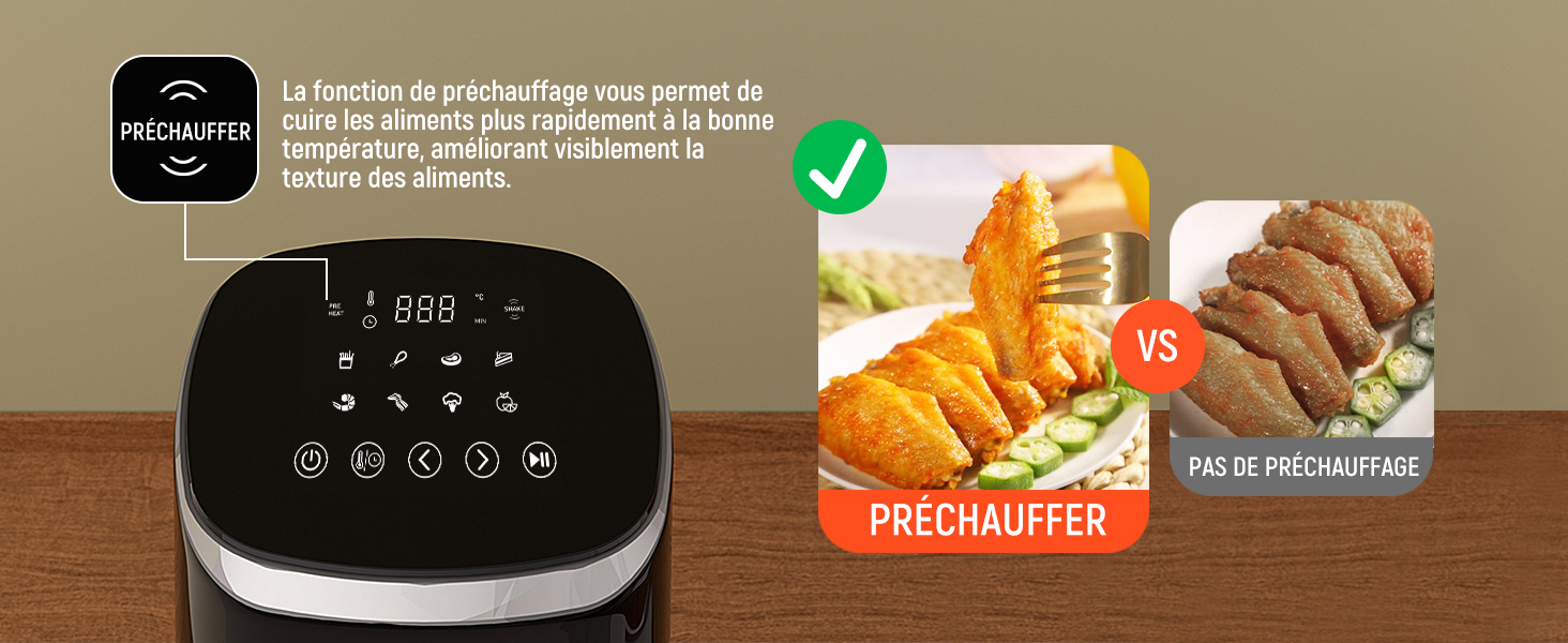 - 9 EN 1 RÉPOND À TOUS VOS BESOINS: Le grand écran numérique avancé dispose de 9 modes prédéfinis (frites, poulet, steak, dessert, fruits de mer, bacon, légumes, déshydratation, préchauffage. Vous pouvez régler le temps (1 à 60 minutes) et la température (65 ° C~230°C) pour tout personnaliser en fonction de vos recettes frites à l’air. Et le rappel de secouer vous permet de savoir quand secouer vos aliments pour une cuisson plus uniforme et des textures croustillantes.