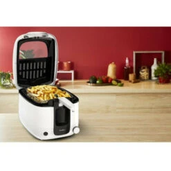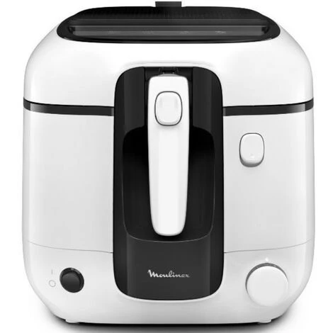 Friteuse Super Uno Moulinex AM312010. La friteuse facile à nettoyer pour cuisiner pour toute la famille ! Dégustez de délicieux aliments frits et croustillants en toute simplicité. Performante et polyvalente, son thermostat réglable de 150°C à 190°C, s’adapte à toutes les températures de cuisson de vos plats préférés. Préparez des portions généreuses pour toute la famille jusqu’à 6 personnes : Capacité d’huile de 2,2 L pour une capacité de 1,5 kg d’aliment. Finies les mauvaises odeurs de friture, la Super Uno est équipée d?une filtration des odeurs grâce à son filtre carbone remplaçable longue durée ! Ultra pratique : bouton permettant l?ouverture automatique du couvercle. Panier avec poignée rétractable qui peut être mis en position égouttage pour plus de sécurité et de praticité. Large hublot de contrôle qui vous permet à tout moment de contrôler la cuisson en toute facilité. La cuve, le panier ainsi que le couvercle sont amovibles et compatibles lave-vaisselle pour un nettoyage en toute simplicité. 1800 W pour une montée en température rapide.