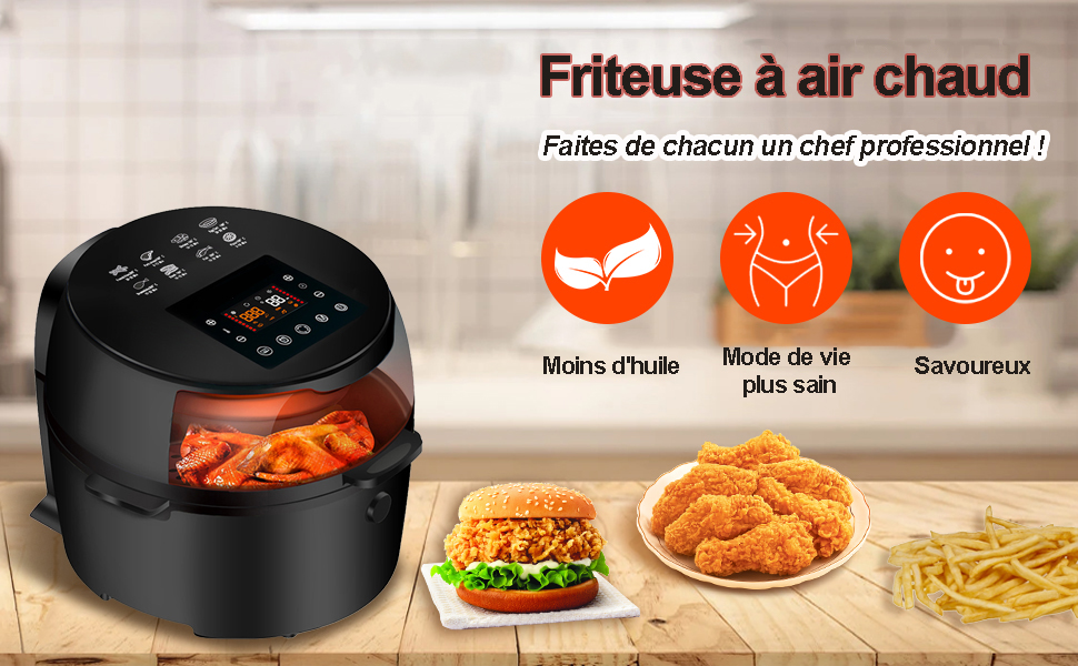 Friteuse à Air Chaud 8L, Friteuse Sans Huile Avec Fenêtre Visible, Écran Tactile, Fonction De Décongélation/réservation 24h/Recettes