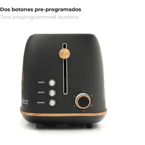 Le grille pain Caprizze Kaito est parfait pour les amateurs de design et de bonne cuisine. Vos toasts seront grillés à la perfection grâce à ses 6 niveaux réglables. Il dispose de deux fentes extra larges de 3,8 cm et 13,5 cm de long pour vous permettre de déguster n’importe quel type de pain. Ses trois fonctions intégrées vous permettent de réchauffer, décongeler et arrêter le grillage.nnCaractéristiques :n- Mesures : 29,2x18x19 cm.n- Matériau : acier inoxydable et polypropylène.n- Couleur : noir mat avec des décorations en bleu, jaune et des détails effet bois.n- Poids : 1,20 kg.n- Puissance : 815W Faible consommation.n- Température de travail : 6 niveaux.n- Système de sécurité : Autostop.n- Thermostat : Oui.n- Tiroir à miettes : Oui.n- Base antidérapante : Oui.n- Contrôle : Analogique.n- Longueur du cordon : 75 cm avec rangement intégré du cordon.n- Modes/Fonctions : 3.n- Voltage : 220-240V.n- Régulateur de température : Oui.n- Certificats : CE, GS, LFGB et RoHS.