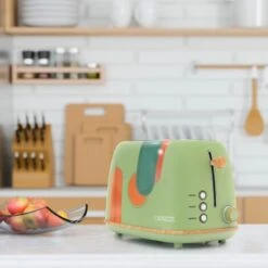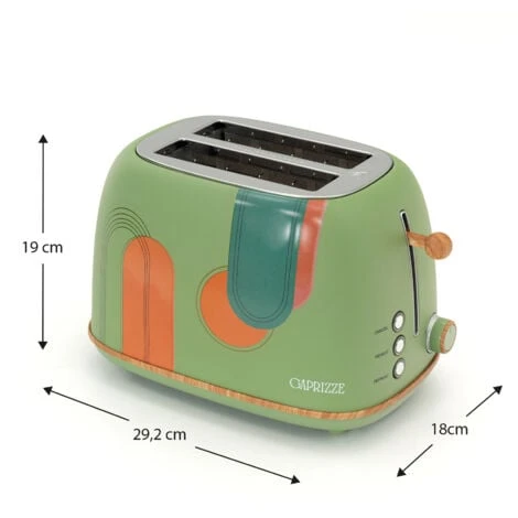 Le grille pain Caprizze Kaito est parfait pour les amateurs de design et de bonne cuisine. Vos toasts seront grillés à la perfection grâce à ses 6 niveaux réglables. Il dispose de deux fentes extra larges de 3,8 cm et 13,5 cm de long pour vous permettre de déguster n’importe quel type de pain. Ses trois fonctions intégrées vous permettent de réchauffer, décongeler et arrêter le grillage.nnCaractéristiques :n- Mesures : 29,2x18x19 cm.n- Matériau : acier inoxydable et polypropylène.n- Couleur : vert mat avec décorations orange et détails effet bois.n- Poids : 1,20 kg.n- Puissance : 815W Faible consommation.n- Température de travail : 6 niveaux et 3 fonctions.n- Système de sécurité : Autostop.n- Thermostat : Oui.n- Tiroir à miettes : Oui.n- Base antidérapante : Oui.n- Contrôle : Analogique.n- Longueur du câble : 75 cm avec protège-câble intégré.n- Voltage : 220-240V.n- Régulateur de température : Oui.n- Certificats : CE, GS, LFGB et RoHS.