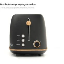 Le grille pain Caprizze Kaito est parfait pour les amateurs de design et de bonne cuisine. Vos toasts seront grillés à la perfection grâce à ses 6 niveaux réglables. Il dispose de deux fentes extra larges de 3,8 cm et 13,5 cm de long pour vous permettre de déguster n’importe quel type de pain. Ses trois fonctions intégrées vous permettent de réchauffer, décongeler et arrêter le grill.nnCaractéristiques :n- Mesures : 29,2x18x19 cm.n- Matériau : acier inoxydable et polypropylène.n- Couleur : noir mat.n- Poids : 1,20 kg.n- Puissance : 815W Faible consommation.n- Température de travail : 6 niveaux.n- Système de sécurité : Autostop.n- Thermostat : Oui.n- Tiroir à miettes : Oui.n- Base antidérapante : Oui.n- Contrôle : Analogique.n- Protection du câble : Oui.n- Longueur du cordon : 75 cm.n- Modes/Fonctions : 3.n- Voltage : 220-240V.n- Régulateur de température : Oui.n- Certificats : CE, GS, LFGB et RoHS.