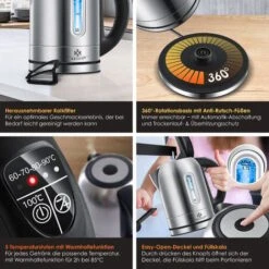 Cette bouilloire en acier inoxydable de haute qualité KESSER est équipée des dernières innovations techniques. La température de l’eau peut être réglée au préalable en fonction de vos besoins, ce qui vous permet de choisir la température parfaite pour chacune des boissons que vous souhaitez consommer. Grâce à la fonction de maintien au chaud intégrée, vous n’avez pas besoin de faire bouillir de l’eau pour chaque tasse, car la température de l’eau est maintenue à 85 degrés pendant 2 heures. Le bec verseur de forme optimale garantit un service sans risque de renverser l’eau. Grâce au filtre anticalcaire intégré, vous évitez le goût de calcaire poudreux dans votre boisson que vous pouvez apprécier pleinement. Le panneau de commande sobre et clair est structuré de manière simple et convient aussi bien aux droitiers qu’aux gauchers. La température que vous avez choisie s’affiche sur le voyant rouge. Pour chaque température réglable, la bouilloire KESSER dispose d’une couleur d’éclairage intérieur spécifique. Sa flexibilité ainsi que sa polyvalence créent une expérience hors du commun.
