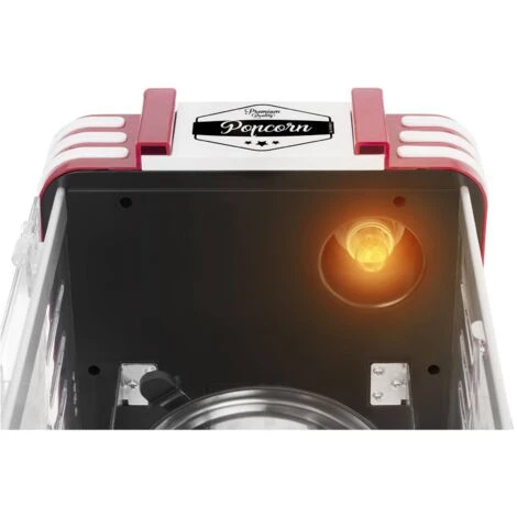 La machine dispose d’une puissance de 300 watts et peut chauffer la cuve à popcorn en quelques secondes. La température de la cuve est réglée automatiquement et atteint 350 °C. Une protection contre la surchauffe arrête la machine à popcorn à air chaud si la température maximale est dépassée. Ainsi, la machine à pop-corn séduit par son design compact et rétro 50’s, ses dimensions de 29 × 32 × 32 × 46,5 cm et son faible poids de seulement 3,45 kg.Â