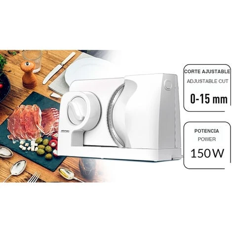 - Disque de coupe en Acier Inoxydable : Le couteau de coupe est fabriqué en acier inoxydable de haute qualité et durable, avec un diamètre de 170 mm. Il est doté d’un puissant moteur de 150 W pour couper les aliments durs.