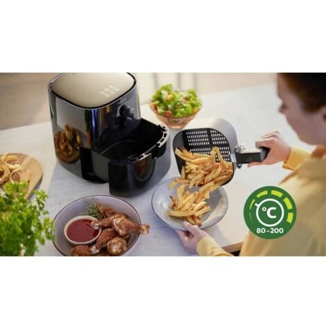 - Technologie Rapid Air brevetéeTempérature de cuisson réglable de 80° à 200° et 60 min. MinuterieCapacité 0,8 kg/4,1 l pour 2 à 3 portionsNettoyage simple et rapideAPP NutriU avec plus de 2 000 idées de recettes pour l’Airfryer