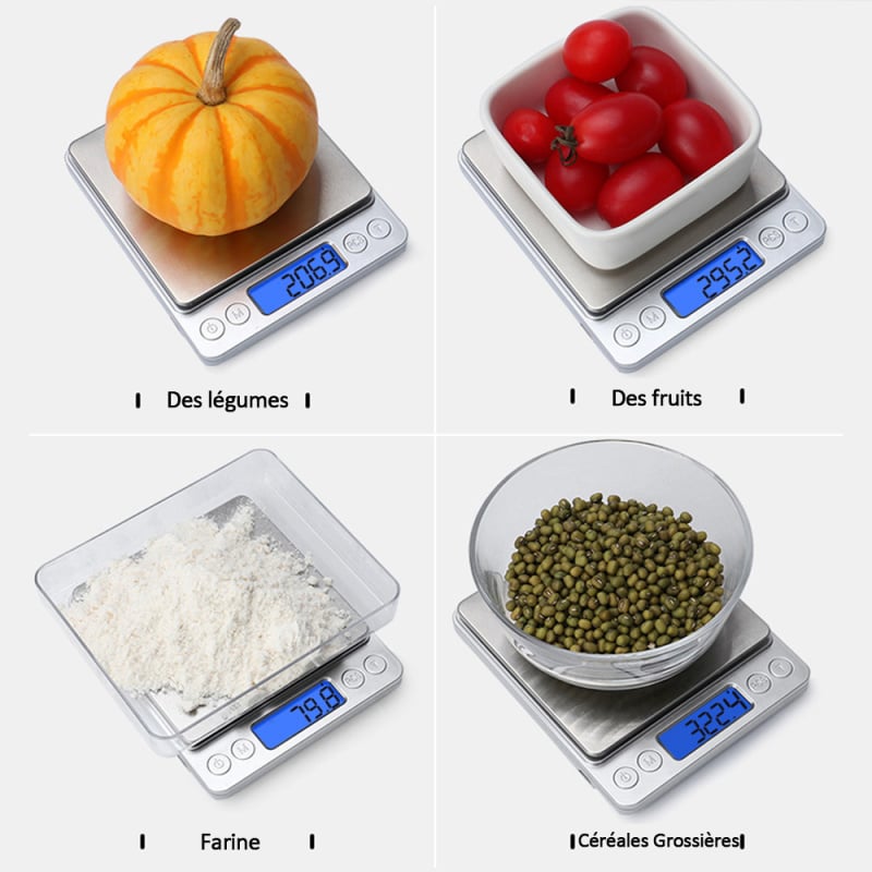 Tare facile : le bouton de tare pratique pour le calcul de la tare vous permet de soustraire le poids de l’assiette ou du récipient, ce qui facilite la lecture précise des ingrédients.
