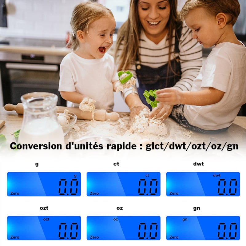 Échelle multifonction : le bouton d’unité automatique convertit instantanément entre 6 unités de mesure (g, ct, dwt, ozt, oz, gn) et affiche les résultats sur un écran LCD facile à lire. suivi de l’apport, de la perte de poids et de l’affranchissement.