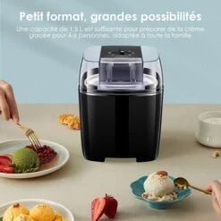 Avec une capacité de 1,5 L, cette sorbetière peut faire jusqu’à 15-16 boules de crème glacée en une seule fois, ce qui en fait un choix parfait pour les familles nombreuses. Grâce à cette sorbetière, vous pouvez savourer des desserts glacés frais pendant les chaudes journées d’été.