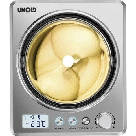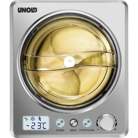 2,5 litres de crème glacée – de quoi faire venir l’été. Vos invités viendront avec plaisir pour savourer vos délicieuses crèmes glacées. Car avec la sorbetière Profi Plus, vous pourrez préparer de grandes quantités de crème glacée, pour toute la famille et les amis. Le « ravitaillement » ne sera pas un problème car le moteur robuste est conçu pour un fonctionnement continu et le compresseur automatique et auto-refroidissant offre une réfrigération en continu. Obtenez des crèmes glacées en seulement 45 minutes (avec des ingrédients préréfrigérés). La sorbetière Profi Plus est aussi adaptée pour les glaces végétaliennes, sans lactose ou contenant de la stévia. L’équipement moderne et pratique est typique de UNOLD® : la sorbetière Profi Plus est dotée d’un corps inox robuste et élégant. Le grand écran LCD indique le temps restant. Elle possède une minuterie numérique, 3 programmes avec sélection de la durée et des touches simples à utiliser. Pour un nettoyage facile, le bac à glace inox est amovible.