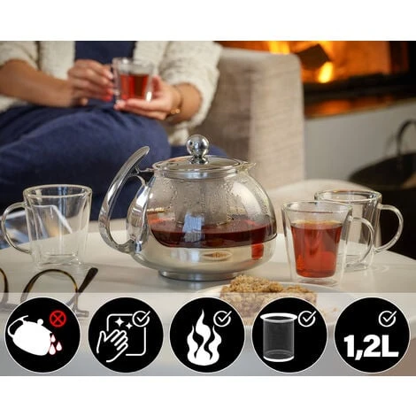 Cette théière faite en verre contient 1200 ml. Equipé d´un tamis amovible en acier inoxydable, le pot est idéal pour préparer du thé et des sachets de thé.
