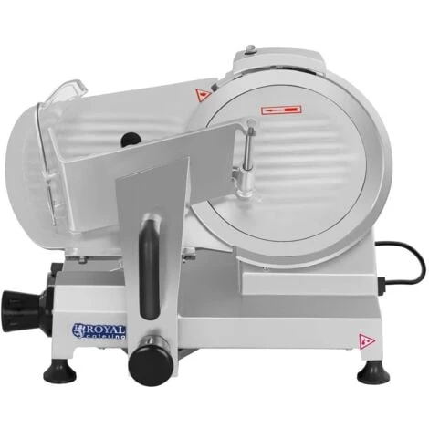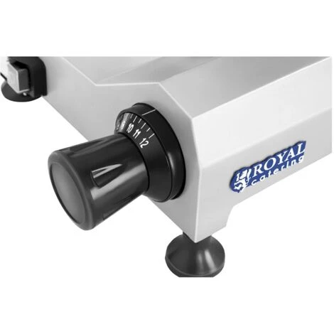 La trancheuse à jambon RCAM-250 de Royal Catering présente une largeur de coupe de 0 à 12 mm, qui se règle en continu de façon très précise à l’aide d’une molette graduée. Pour assurer un travail rapide, l’appareil de restauration a été équipé d’un moteur puissant de 150 watts, lequel permet à la lame d’atteindre une vitesse de rotation considérable de 352 tr/min. Grâce à son diamètre de 250 millimètres, la lame de la trancheuse convient aux saucisses de petit et de grand diamètre. Bien évidemment, cet appareil permet aussi de couper le fromage. Pour ce faire, nous recommandons d’utiliser une lame avec revêtement Téflon, à laquelle la plupart des fromages ne colleront pas.
