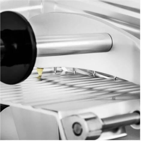 Cet appareil est équipé d’un moteur électrique de 150 W entraînant la lame à une vitesse de 480 tr/min. Sa lame circulaire de 250 mm tranche les fromages les plus durs comme si c’était du beurre et réalise des tranches d’une épaisseur de 0 à 8 mm, réglage modifiable en continu. La trancheuse à la coupe des saucissons et fromages d’une largeur maximale de 17,5 cm et d’une hauteur maximale de 14 cm.