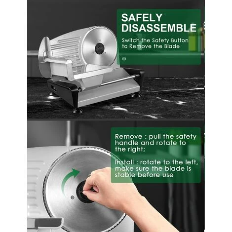 Protection de Sécurité : les pieds à ventouse antidérapants, le poussoir de nourriture et l’interrupteur marche/arrêt interne offrent une protection de sécurité supplémentaire, vous pouvez utiliser cette trancheuse à la maison en toute confiance.