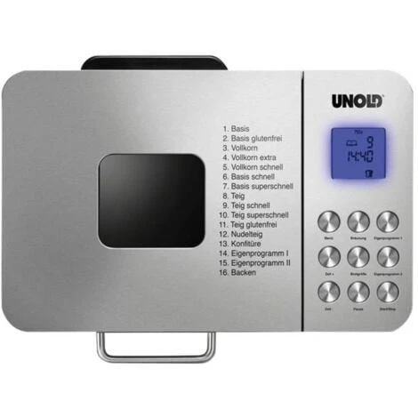 L’élégant BACKMEISTER® de Unold® à cuve en acier inoxydable vous garantit des repas sains faits maison. Car il ne sert pas seulement à cuire du pain. A présent, BACKMEISTER® vous permet également de faire des confitures et de préparer des pâtes alimentaires (nouilles). Et pour répondre exactement à tous les goûts – que ce soit un pain aux graines de courge à croûte particulière (degré de cuisson et taille du pain au choix), de confiture élaborée avec des fruits de saison ou bien de pâtes avec des épices spéciales. La préparation dans le moule de cuisson à revêtement céramique est maîtrisée grâce aux 16 programmes pour pâte à pain jusqu’à 1 000 g, pour les compotes/confitures et pour les pâtes alimentaires. Tous les programmes sont également adaptés au pain sans gluten. De nombreuses fonctions vous permettent de fabriquer facilement du pain, de la confiture et des nouilles : fonction maintien au chaud jusqu’à 60 minutes, écran LCD, grand hublot et fonction pause. Un gobelet mesureur, un crochet de pétrissage et de délicieuses recettes sont inclus.